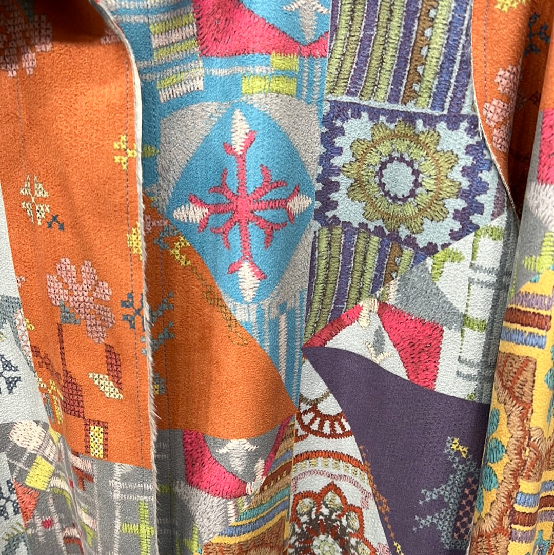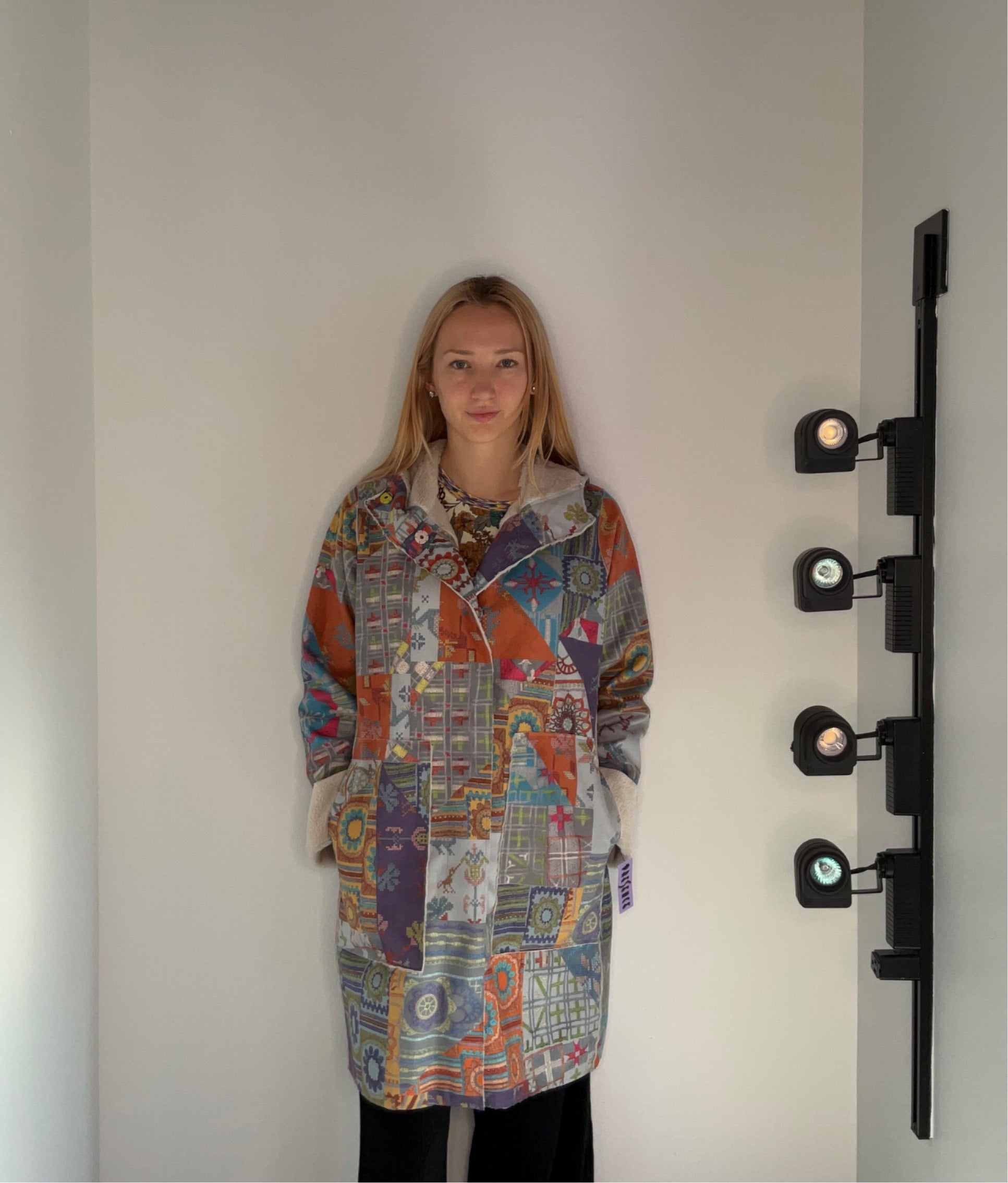 Soft fur lined coat. Knee length. Model is wearing a size S. 92% polyester. 8% spandex.
