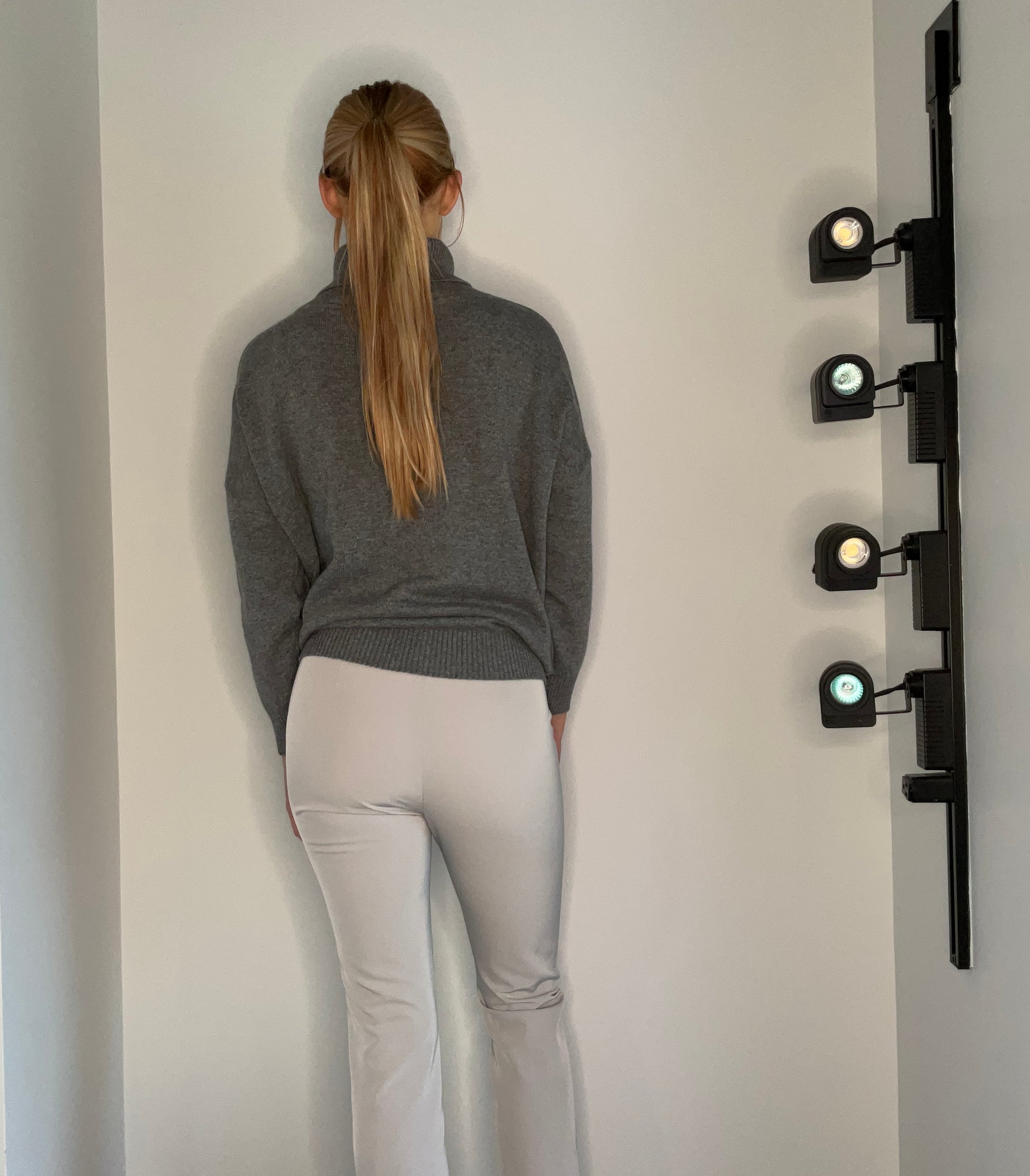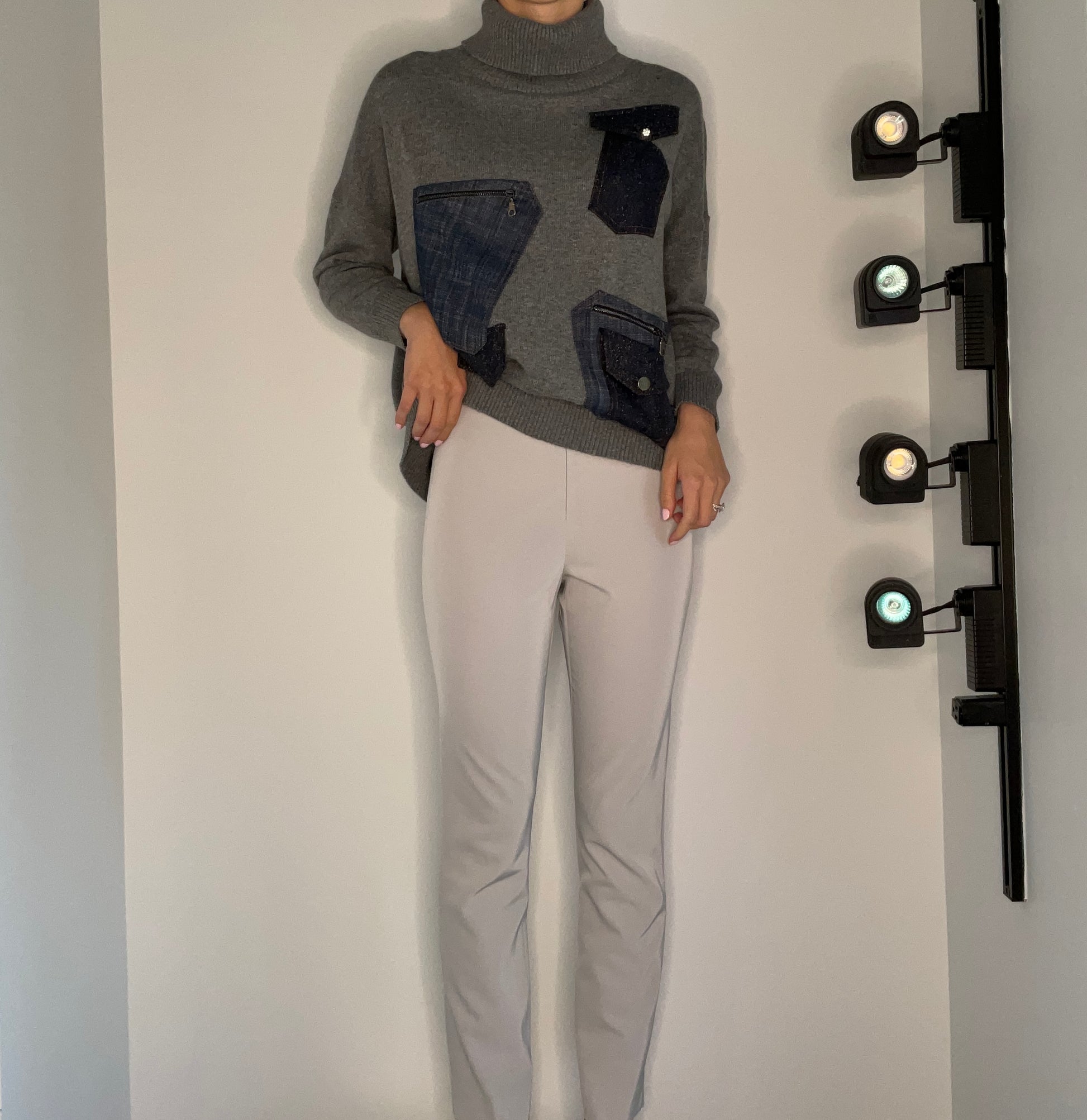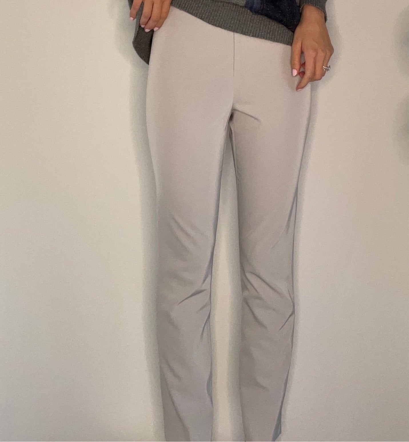 Zipper in front. Model is wearing a size 2. 94% Polyester. 6% Spandex.