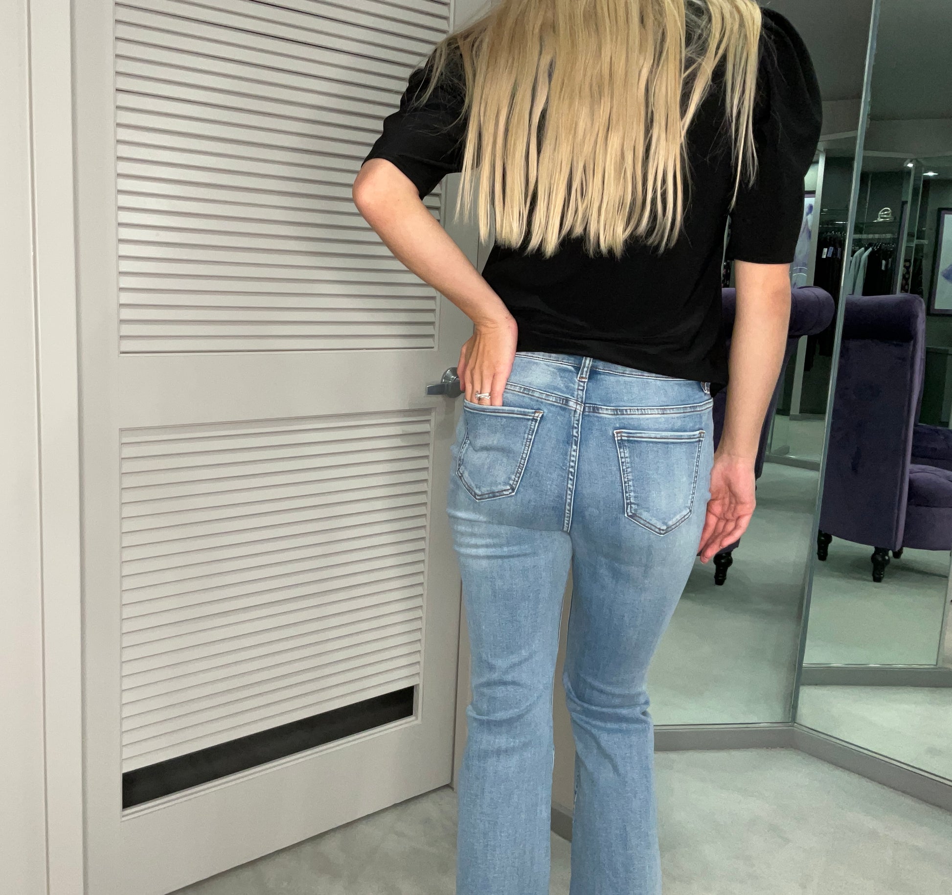 BLUE EMBROIDERED TRIP RAW EDGE JEAN