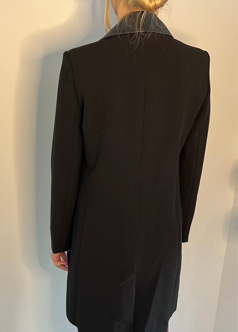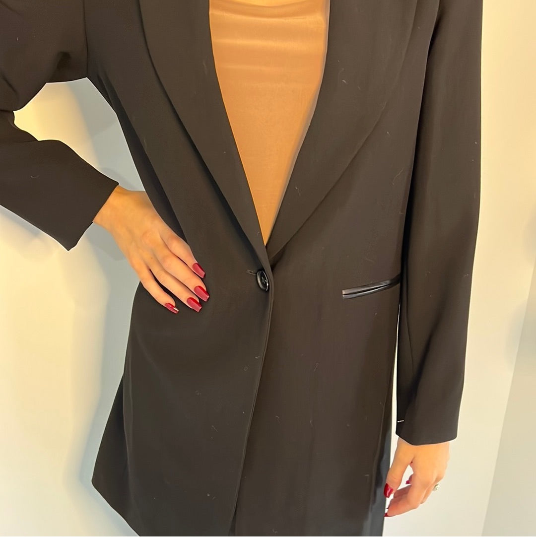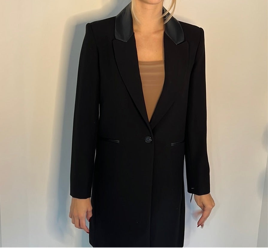 Long coat with faux leather pocket and collar detail. Button front. 70% polyester 24% viscose and 6% spandex. Model is wearing a small.