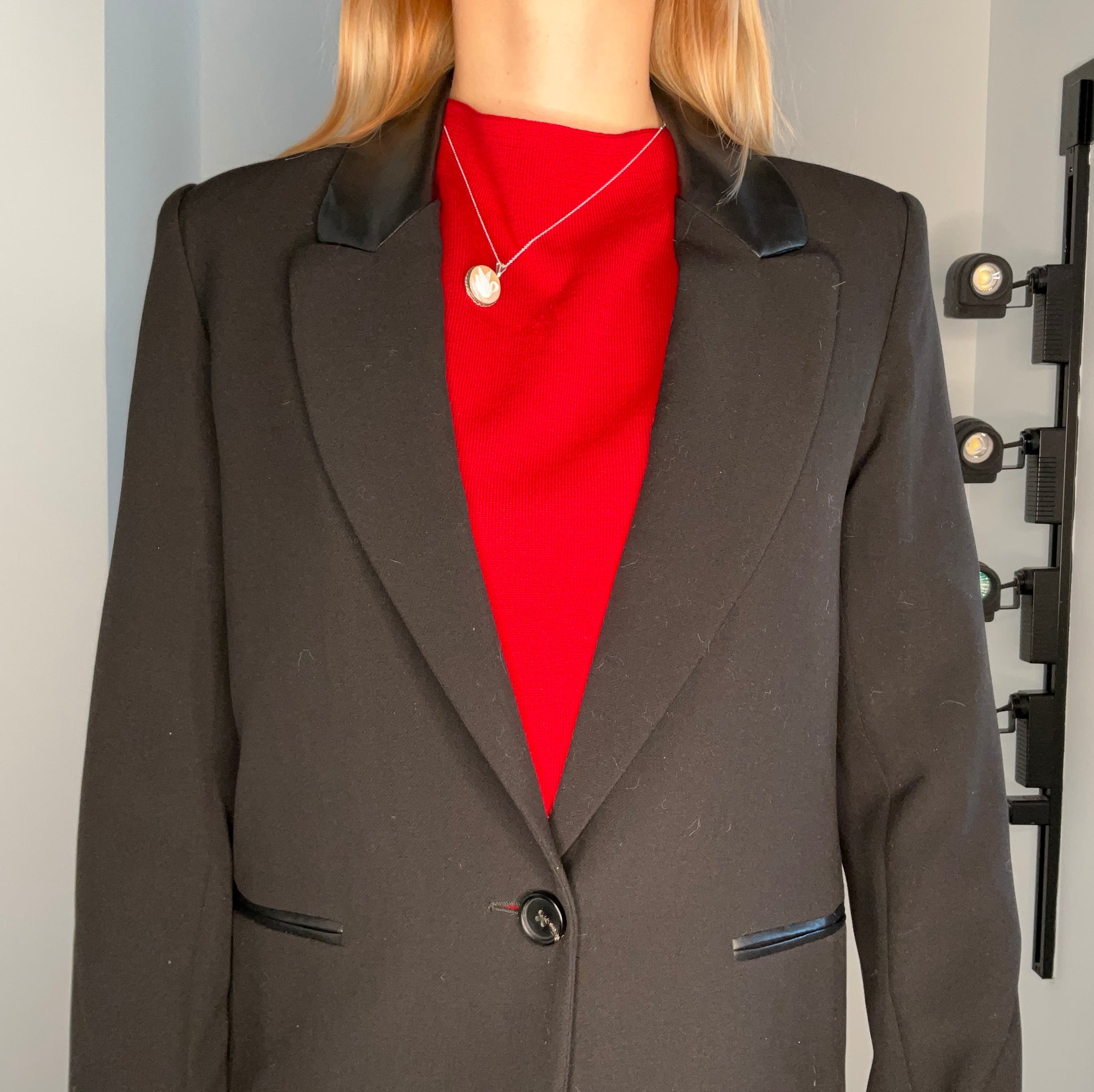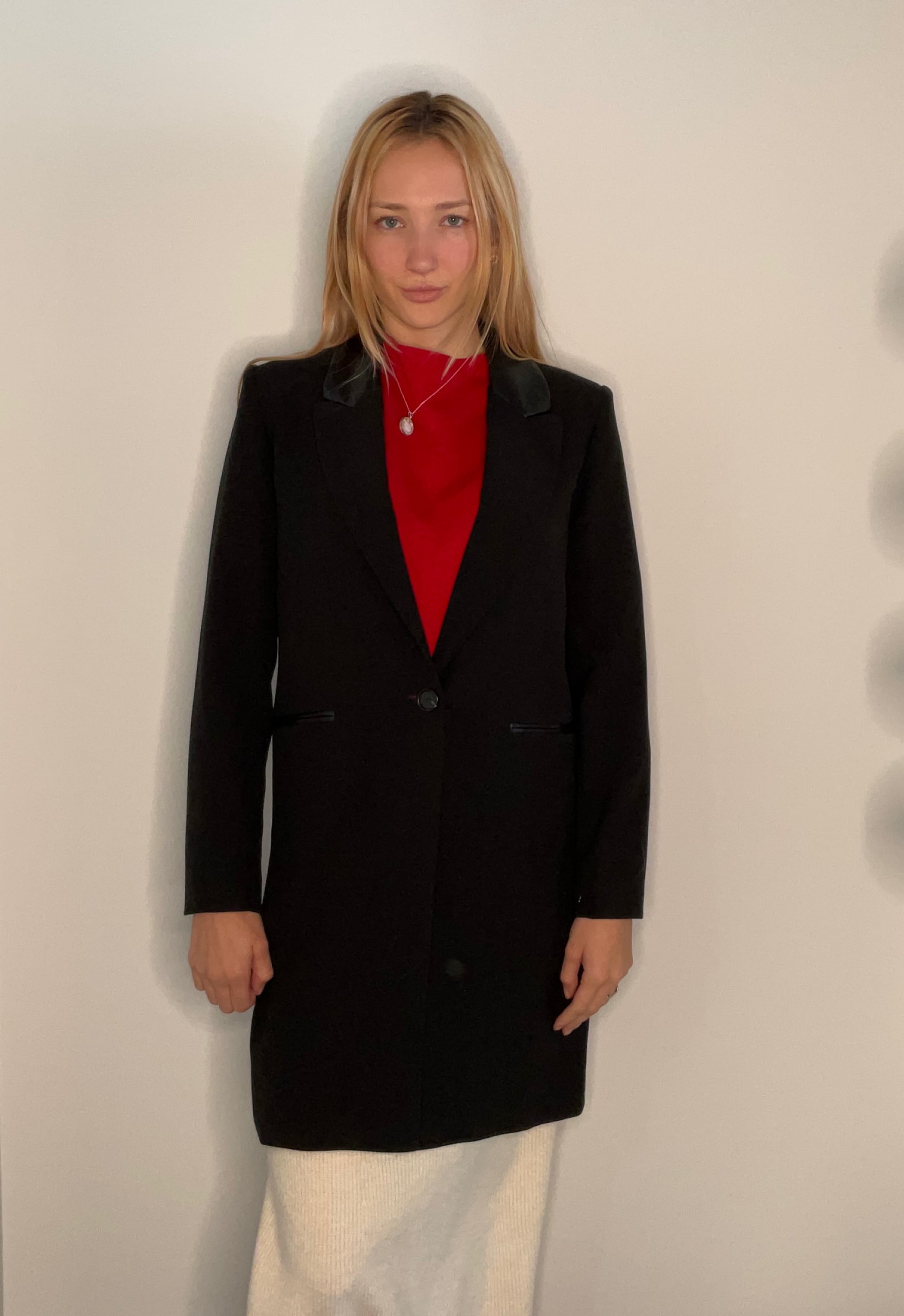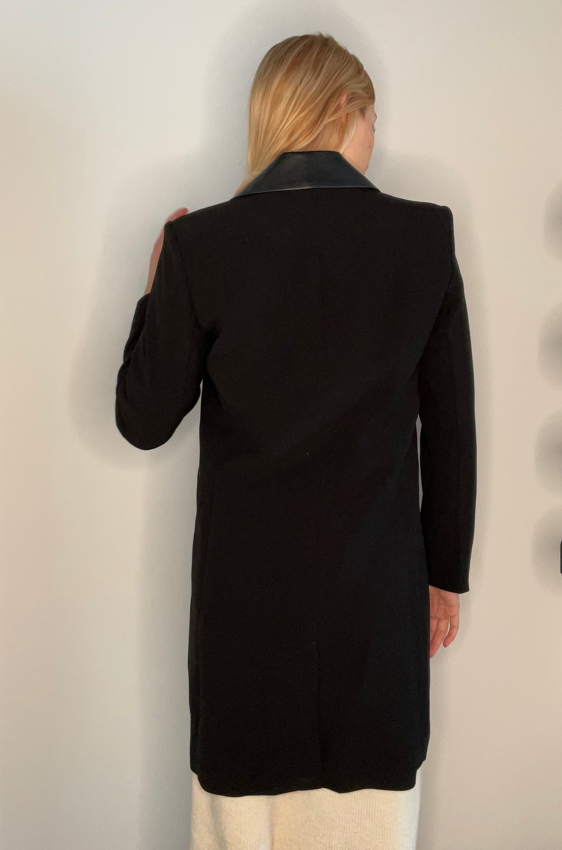 Long coat with faux leather pocket and collar detail. Button front. 70% polyester 24% viscose and 6% spandex. Model is wearing a small.