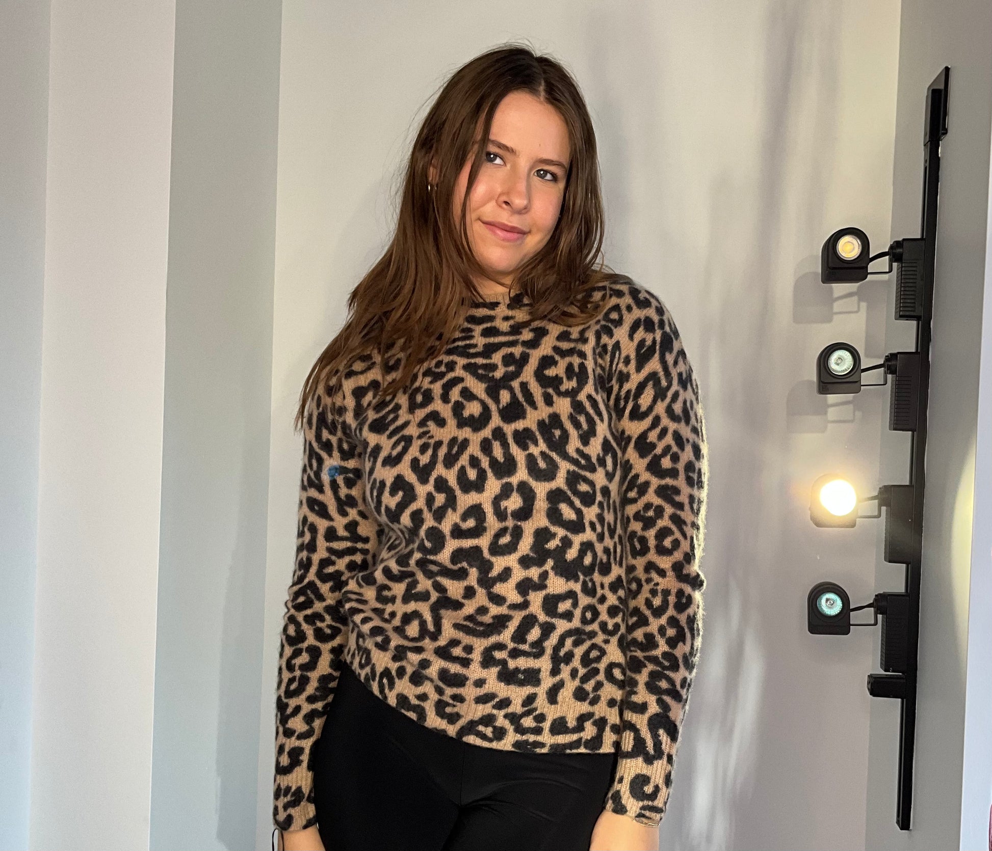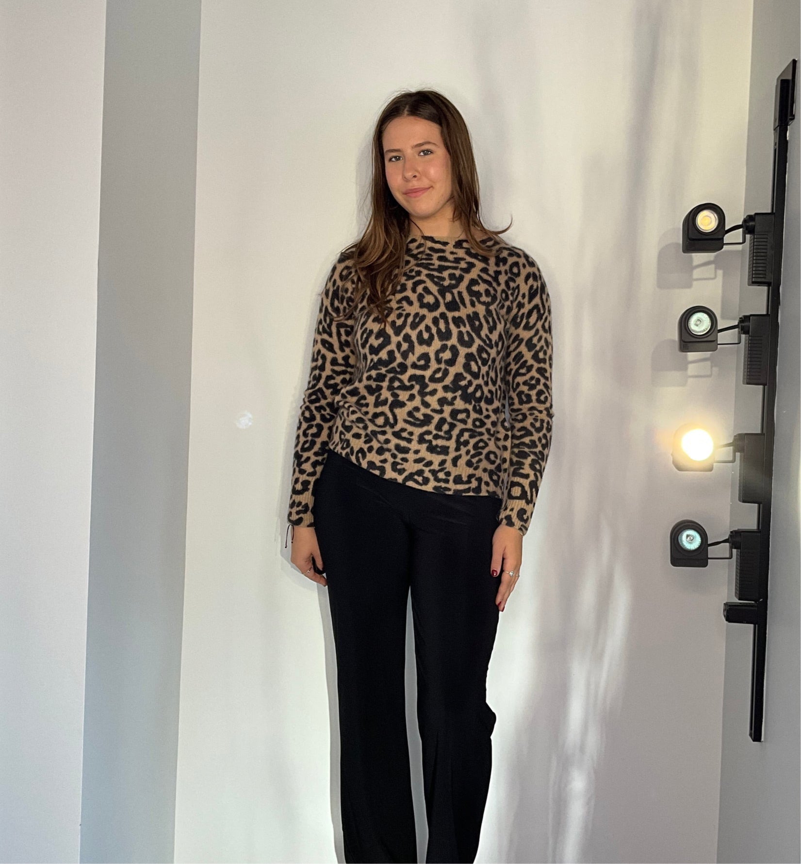 Brown Cheetah Print Cashmere Sweater. Model is wearing size S. 100% cashmere.