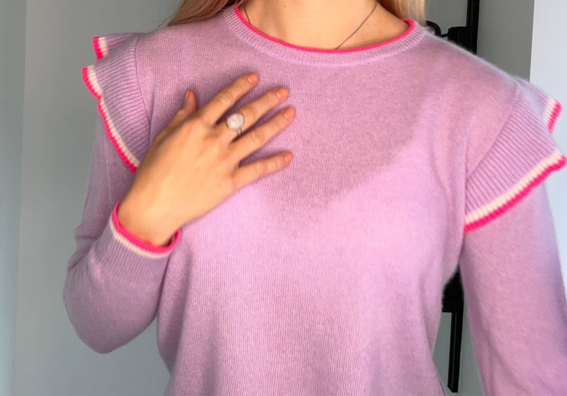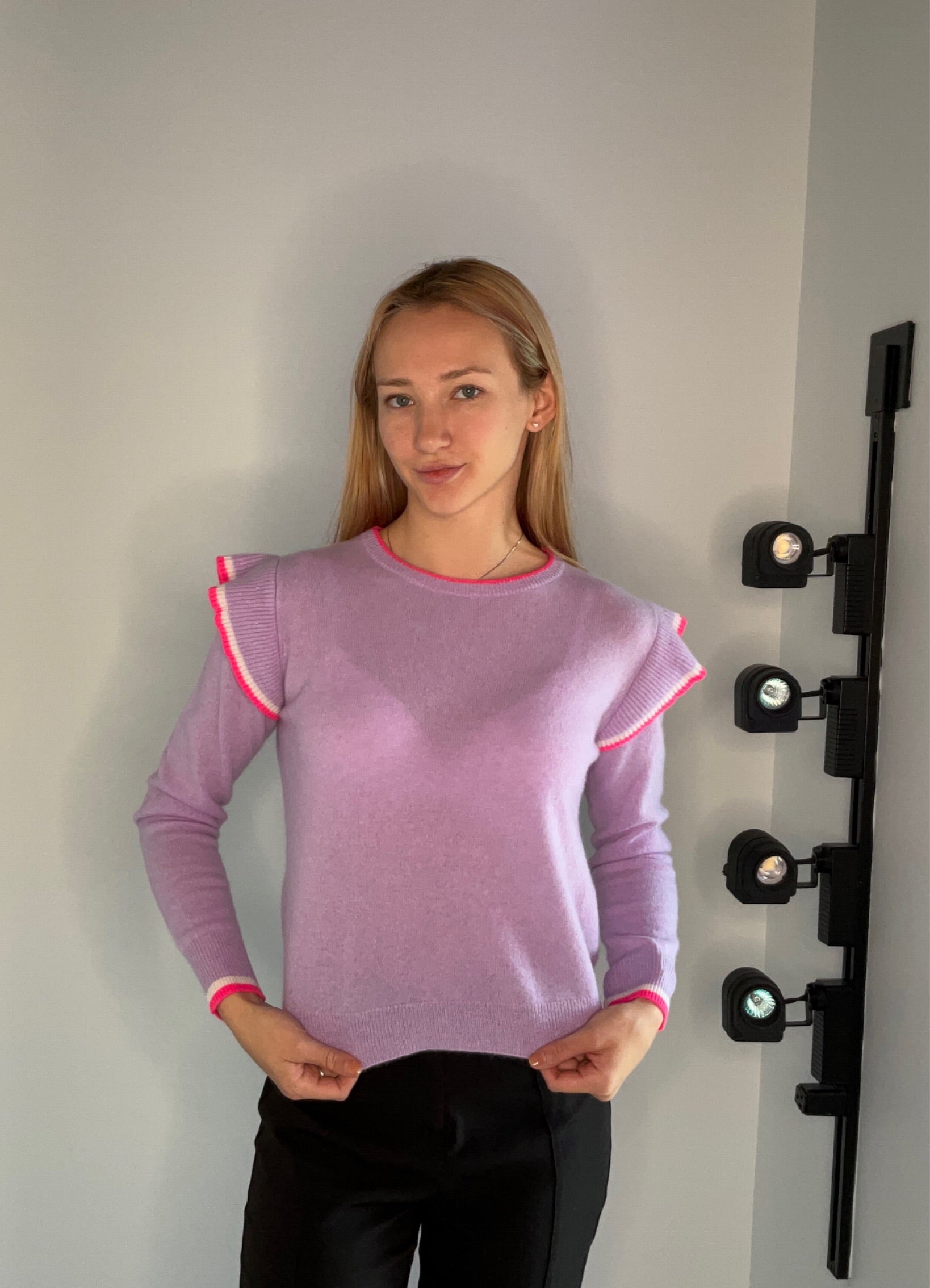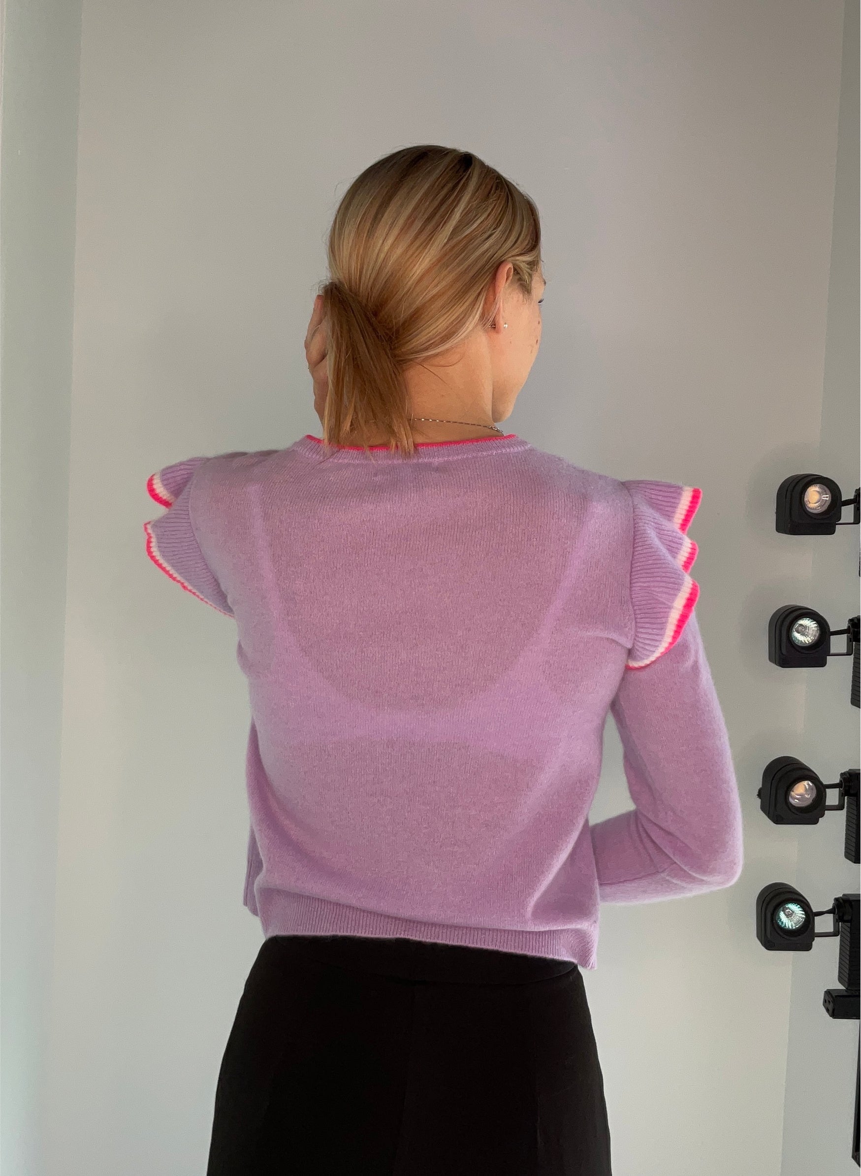 100% cashmere. Purple frill top with hot pink and white. Model is wearing a size S.