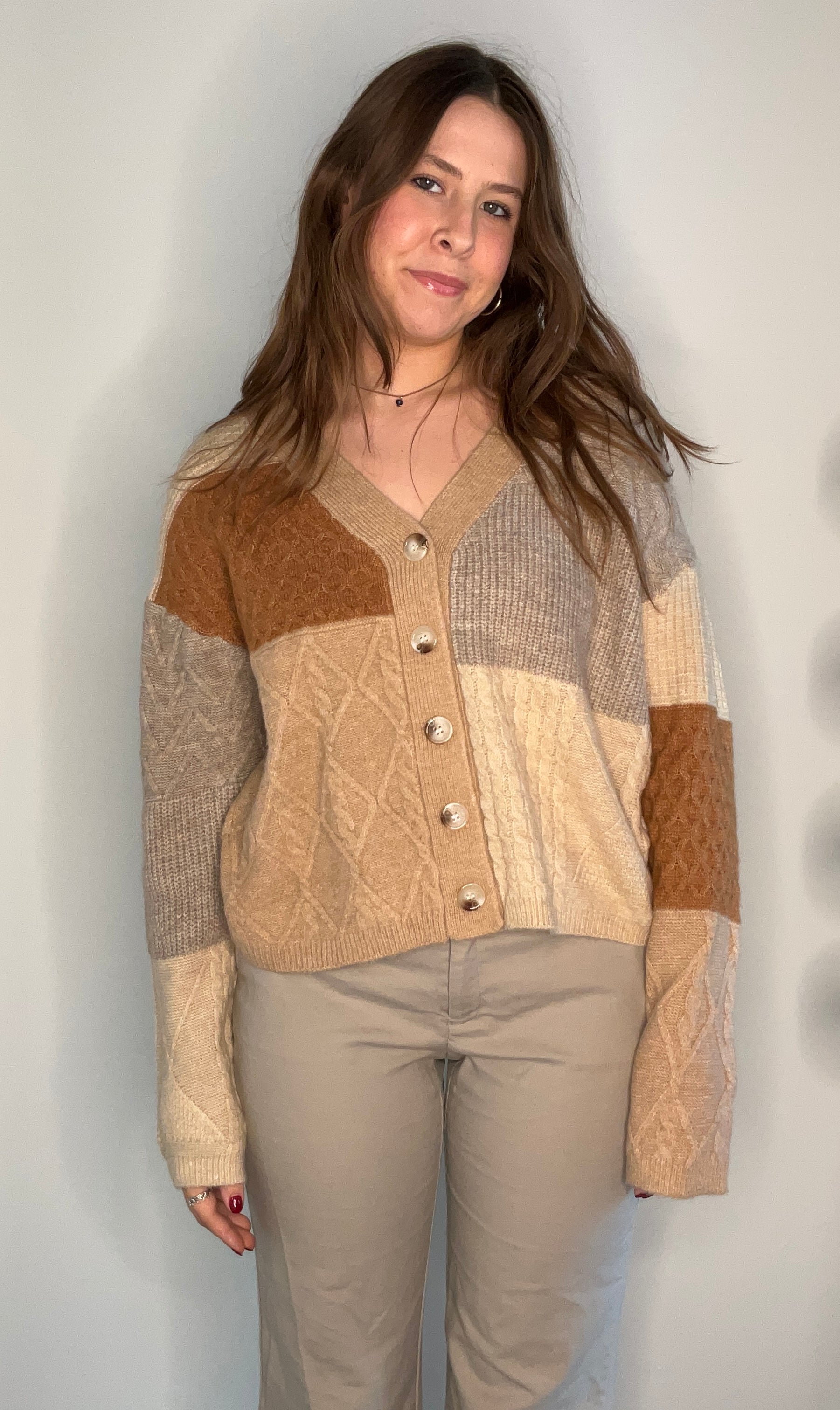 Model is wearing size M. 74% acrylic. 22% polyester. 4% spandex.