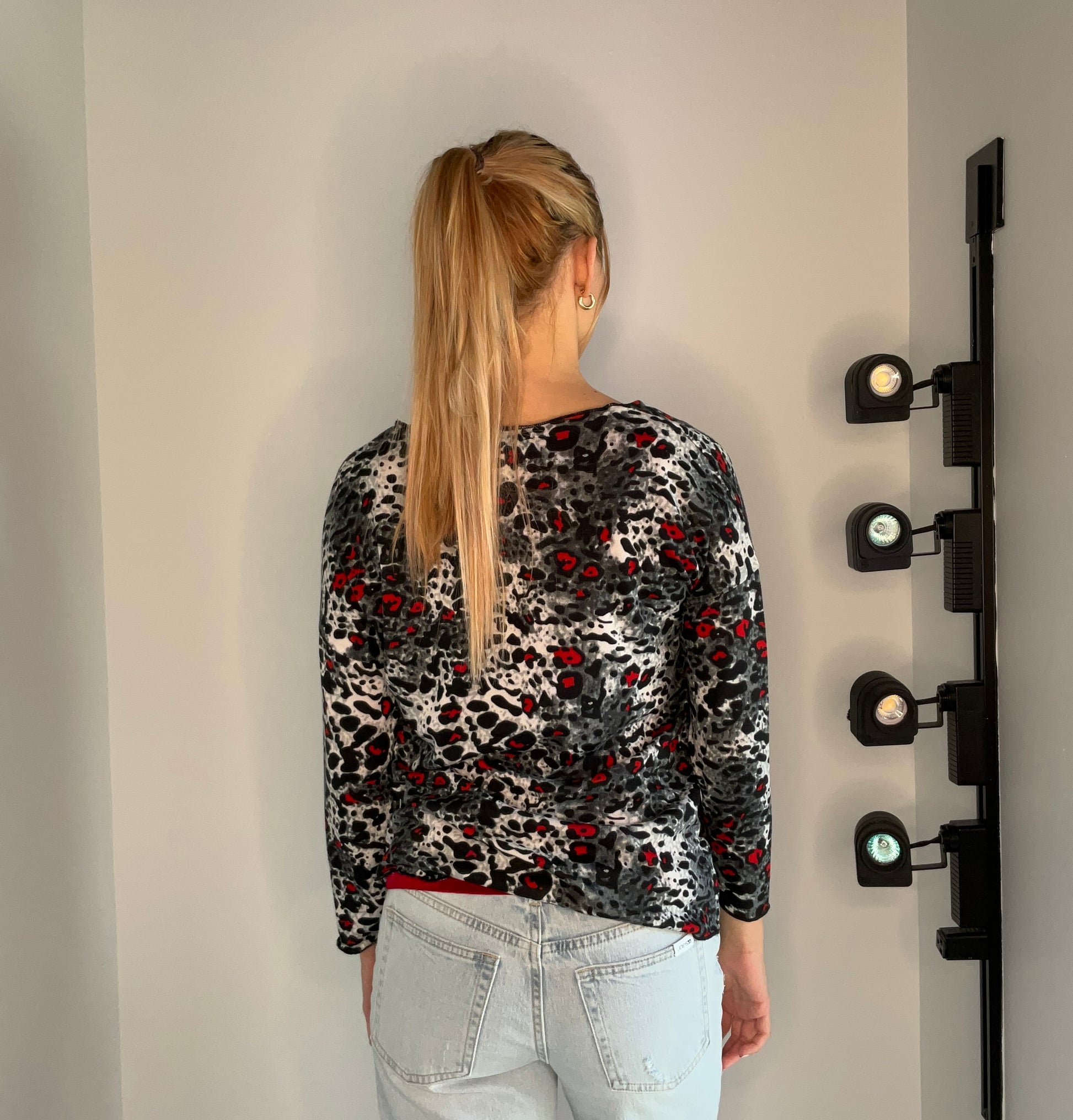 Cheetah print top. 95% polyester. 5% spandex. Model is wearing a size S.