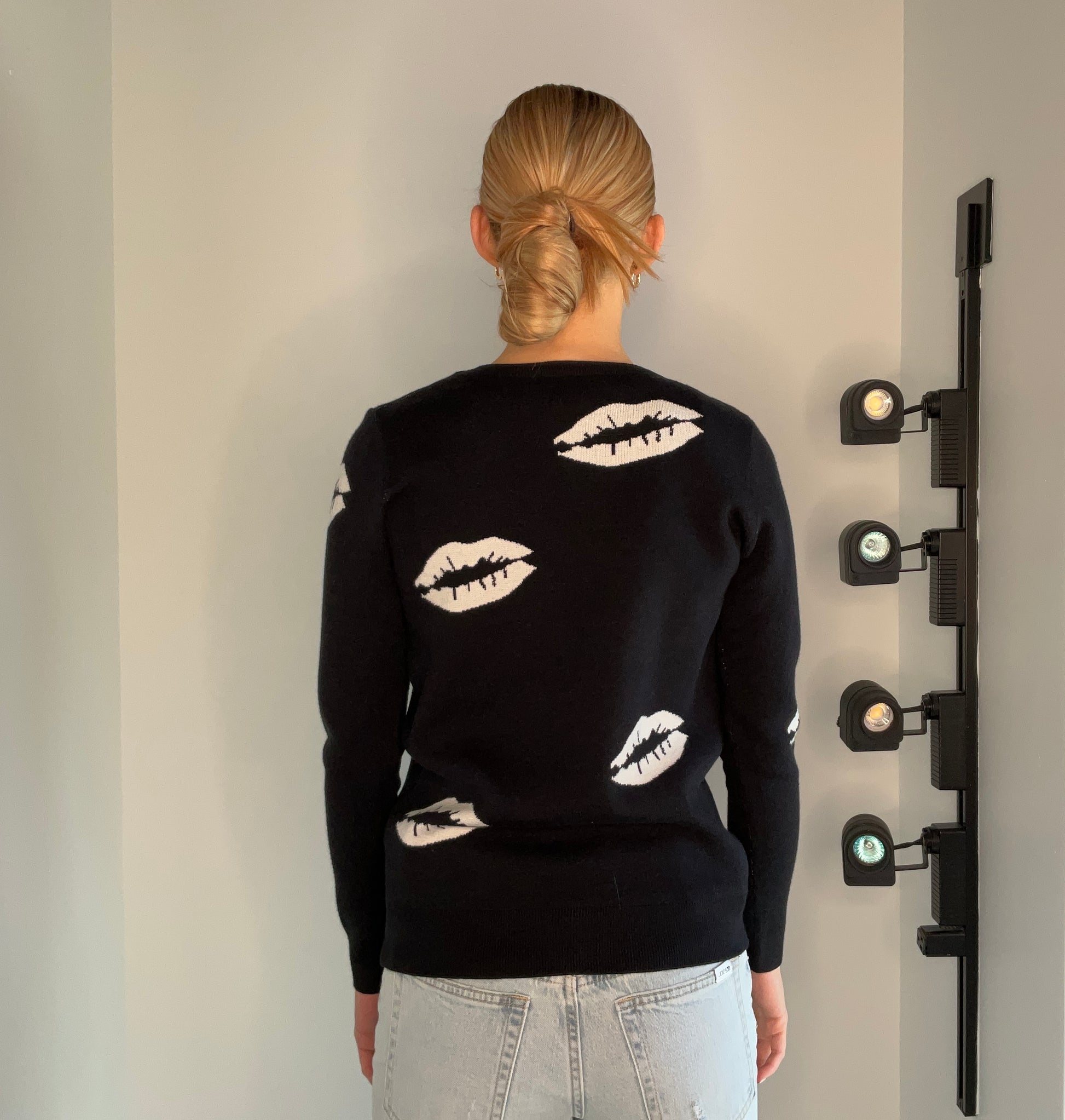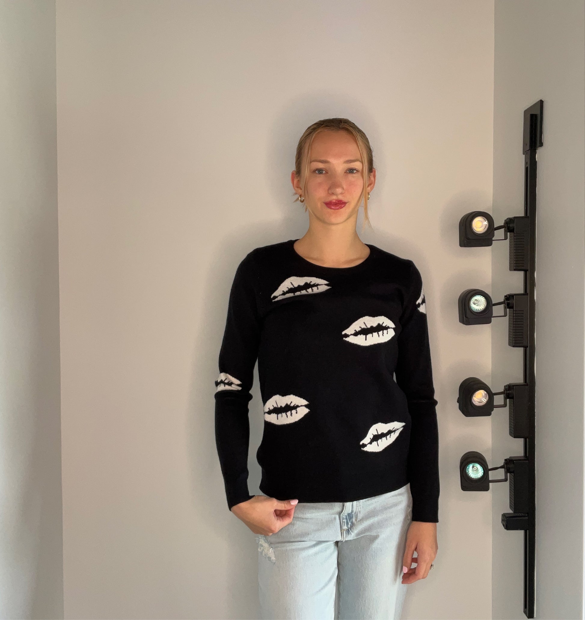 Lip blacks and white sweater. Model is wearing a size S. 52% viscose. 22% nylon. 26% polyester.