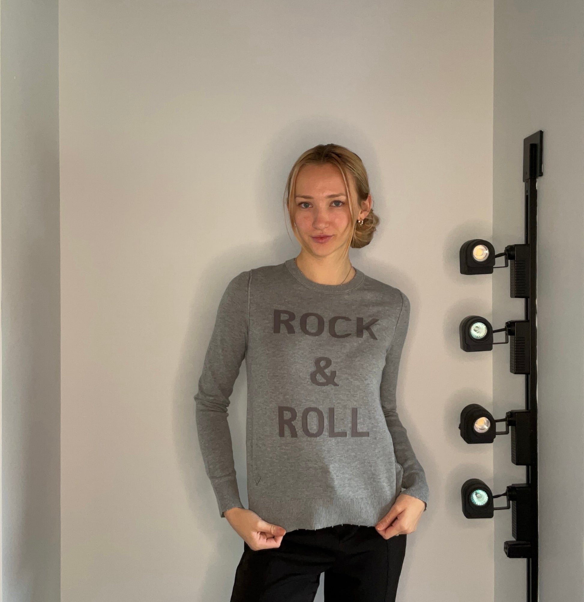 Grey crew neck sweater. 100% cotton. Model is wearing a size S.