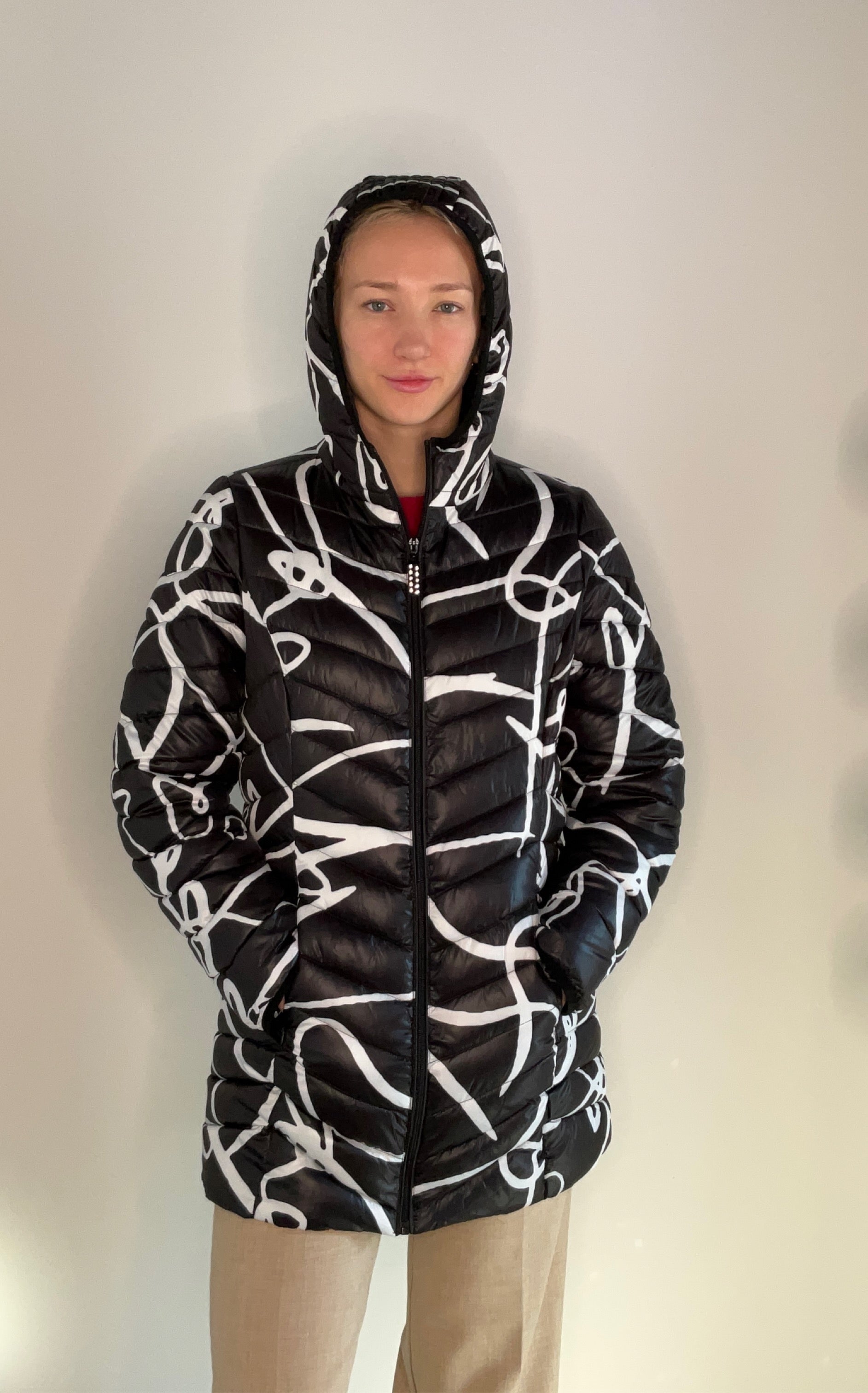 Long puffer coat with crystal zipper detail with a scribble print all over. 100% polyester. Model is wearing a size small.