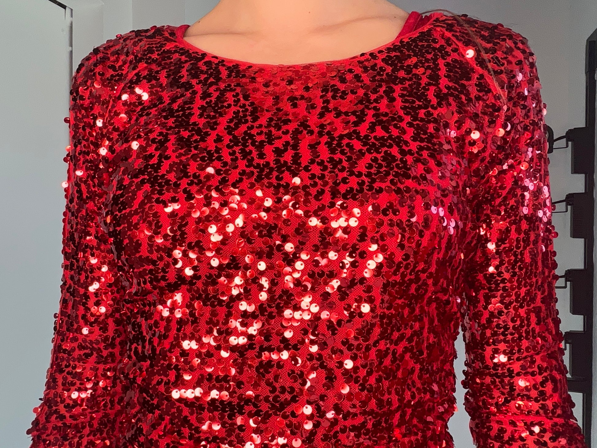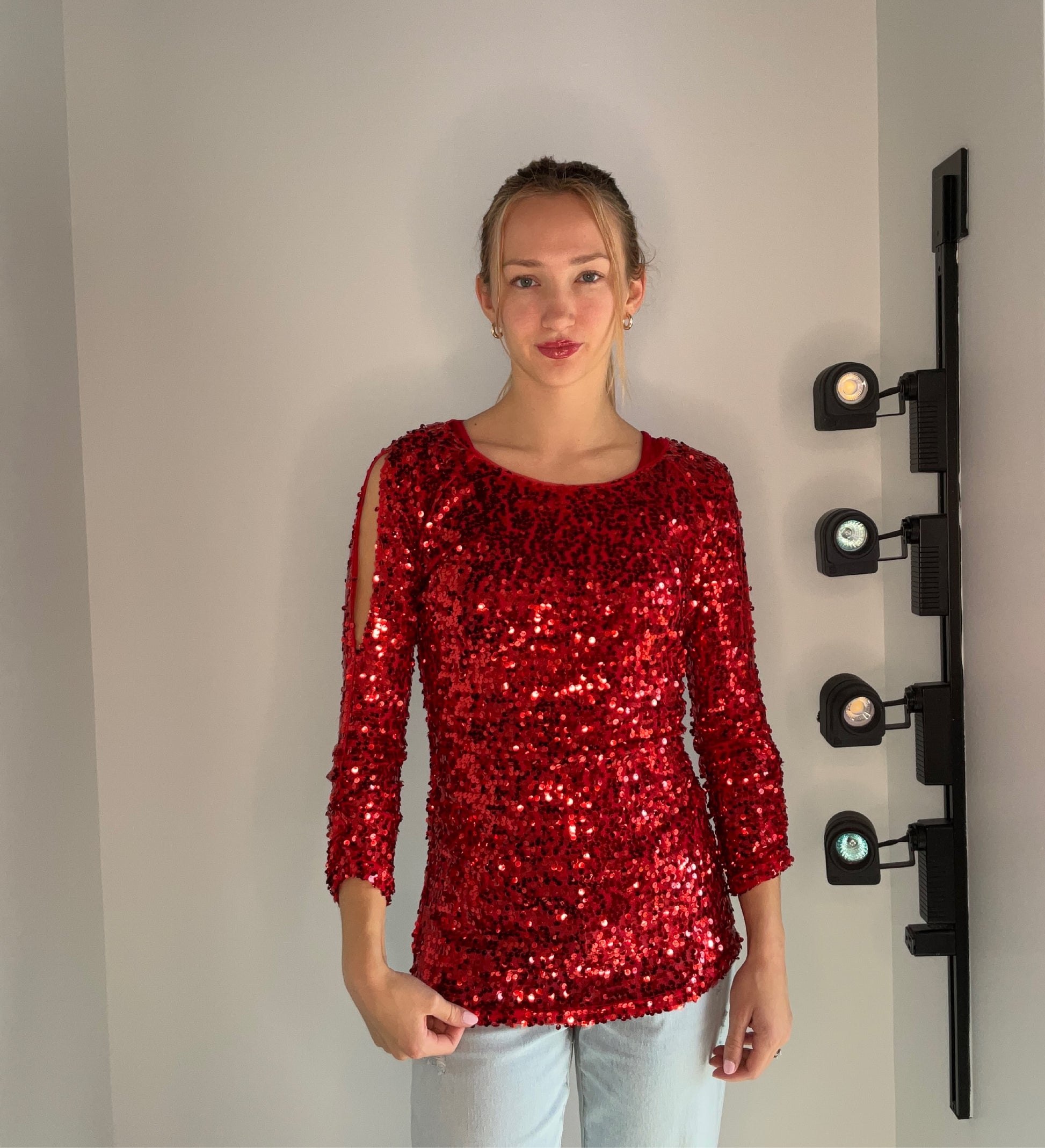 sequin top with cut out on arm for red top. Model is wearing a size S. Ground fabric 100% nylon. Sequins 100% polyester.
