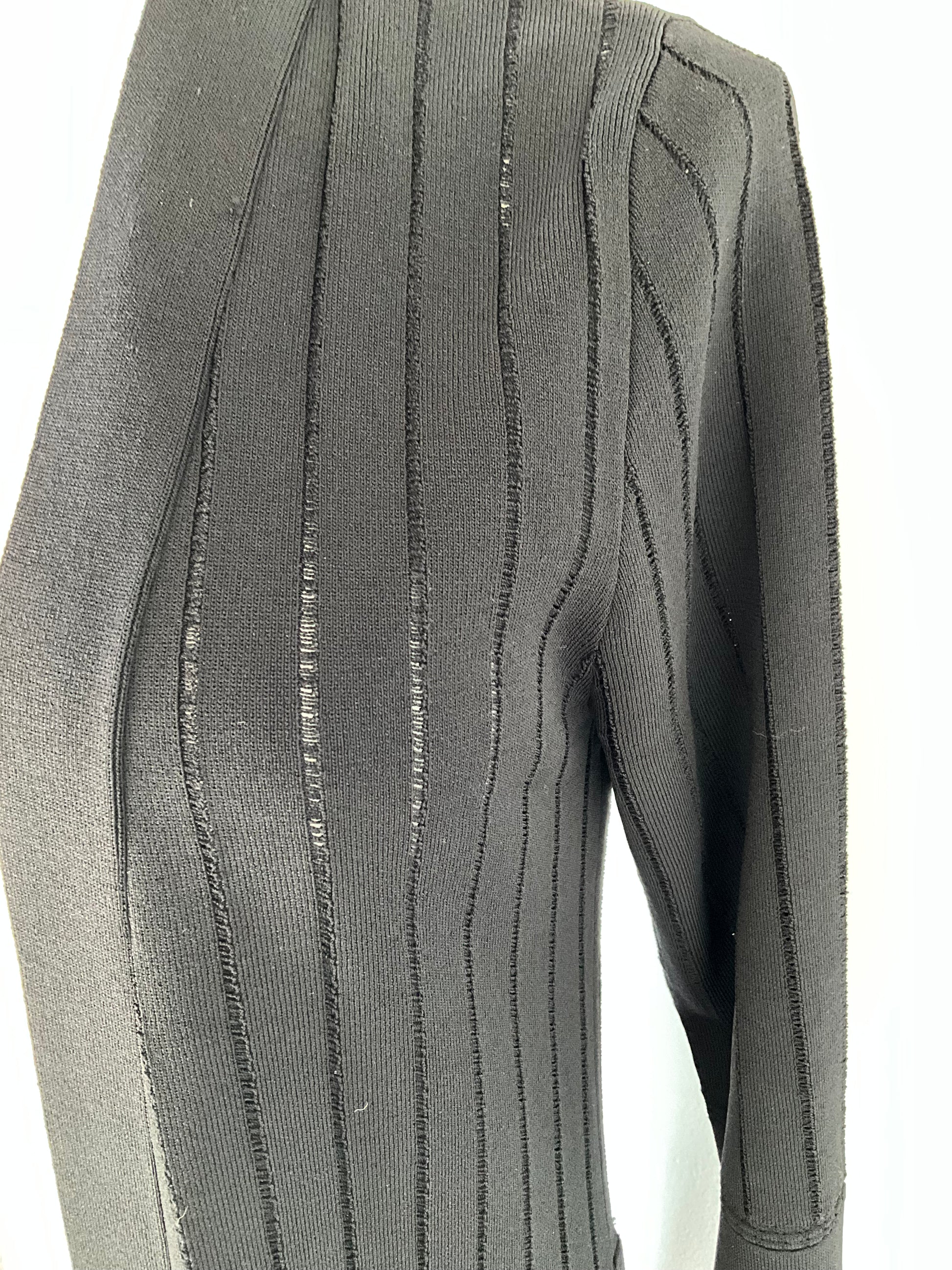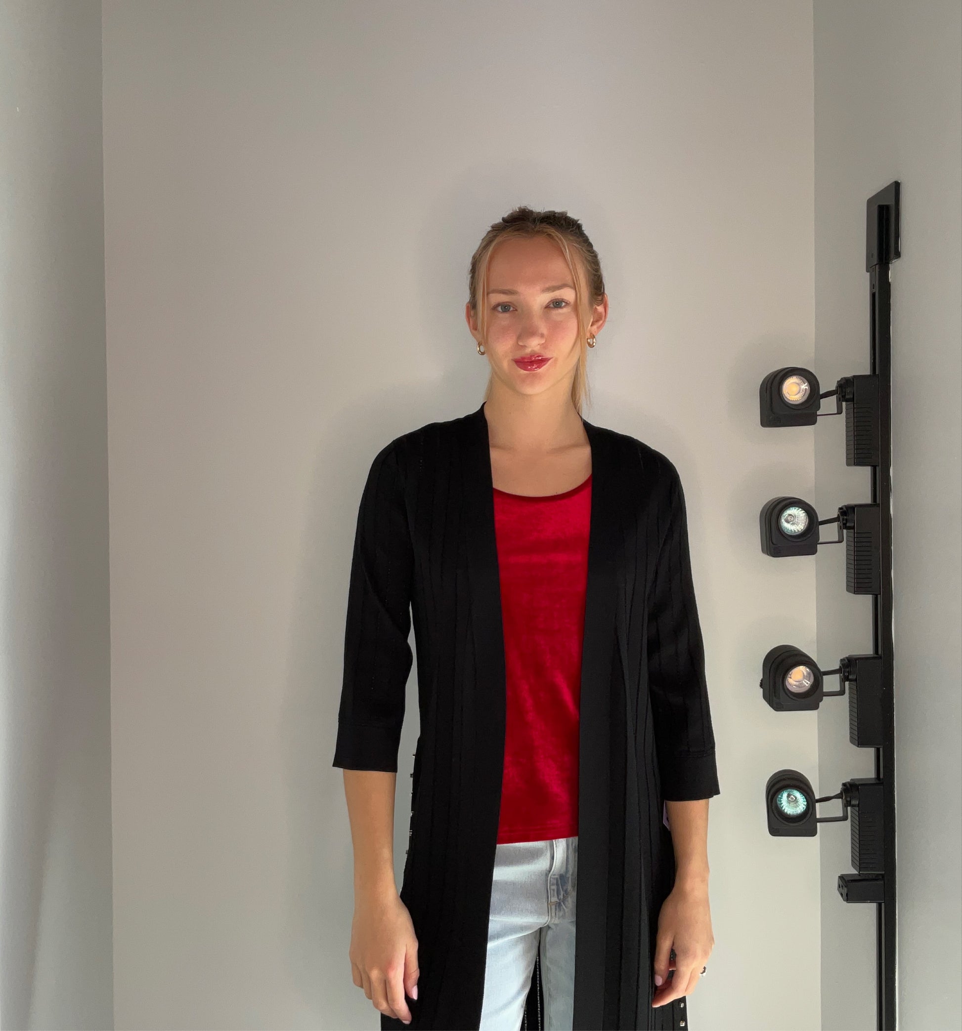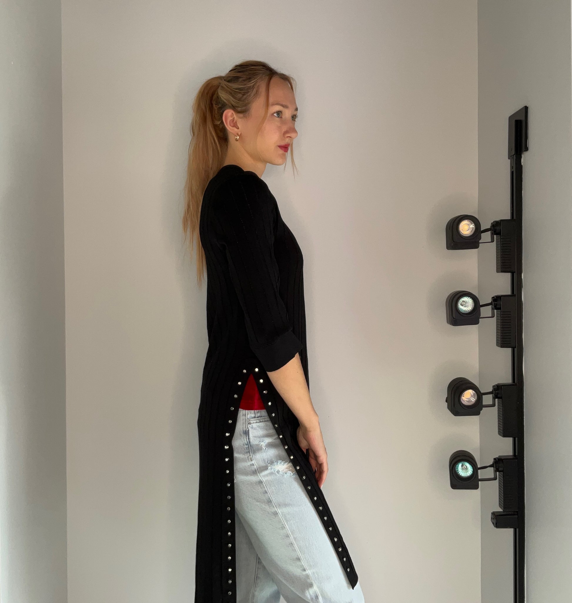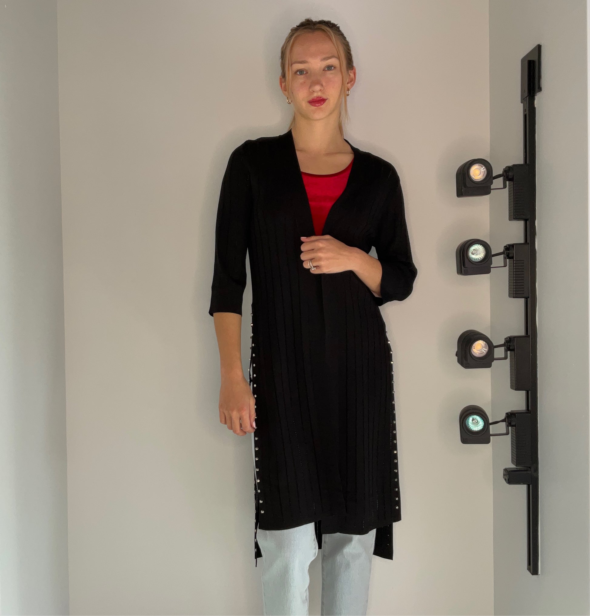 Studded cardigan. Slits in side. 65% viscose. 35% nylon. Model is wearing a size S.