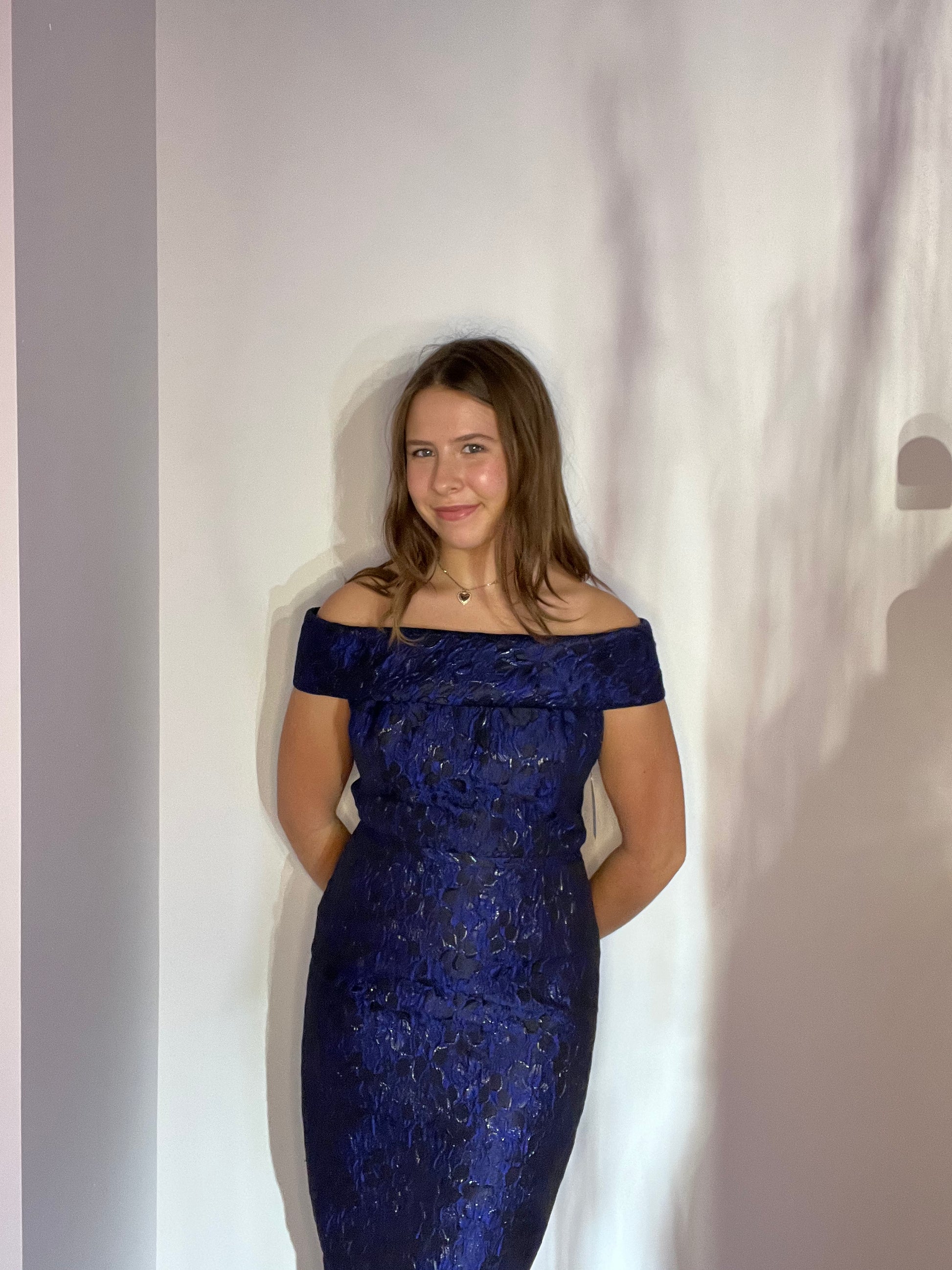 Off the Shoulder Navy Dress model is wearing size 8. 82% polyester. 18% metallic.