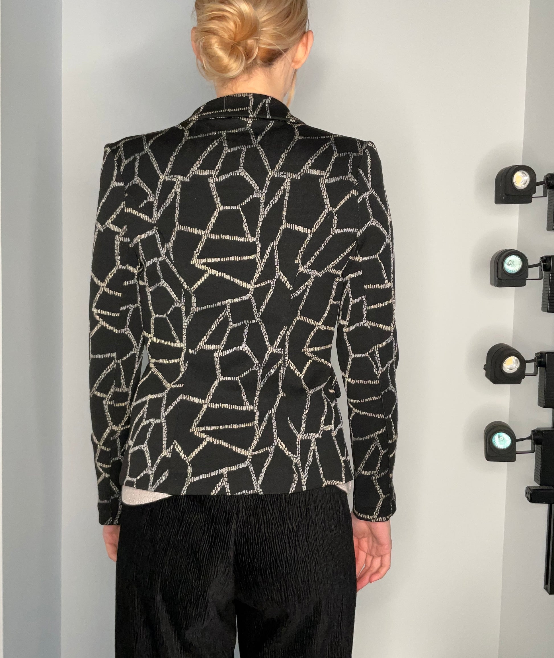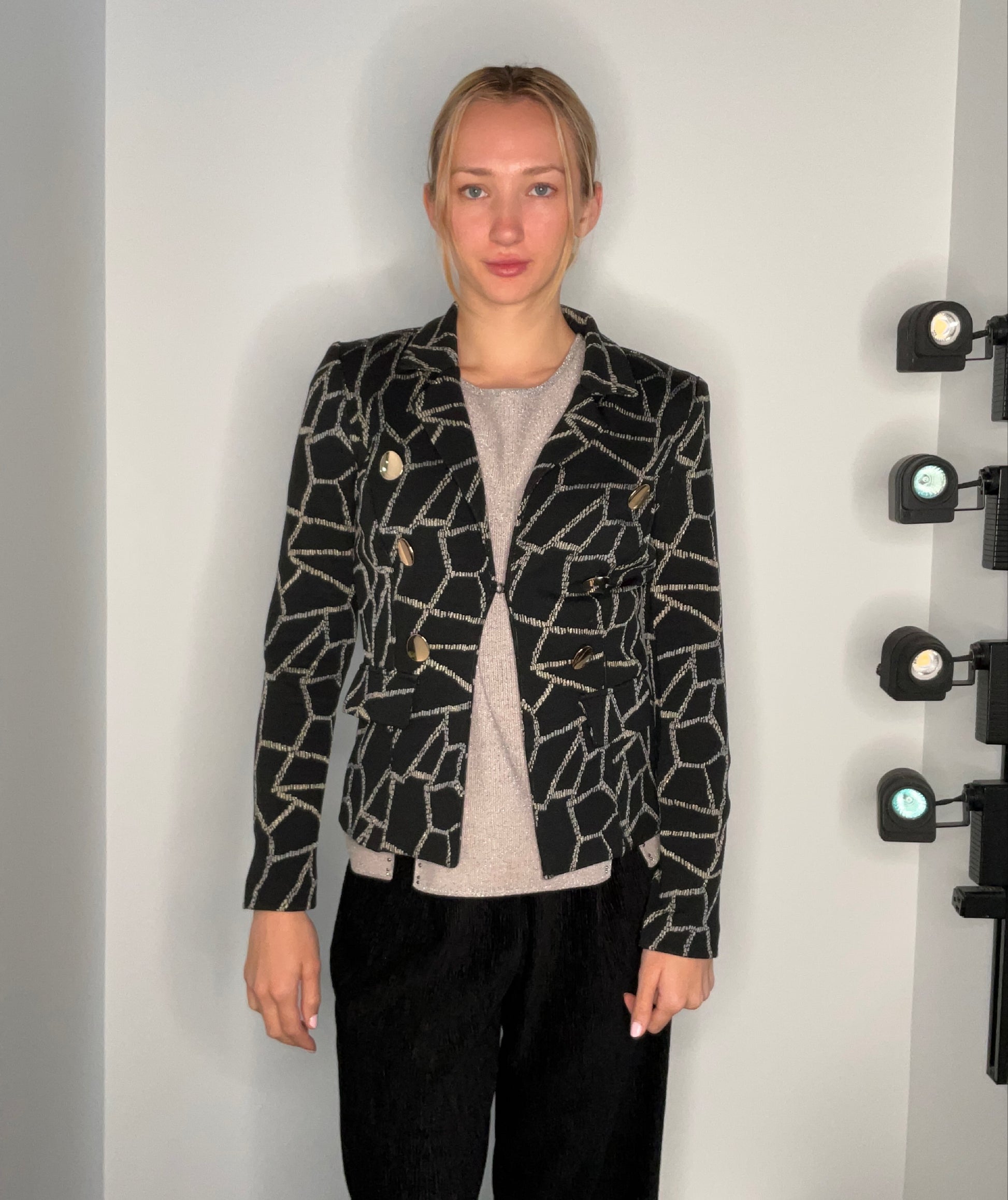 Model is wearing a size 2. 45% nylon. 25% polyester. 25% lurex. 5% Elastane.