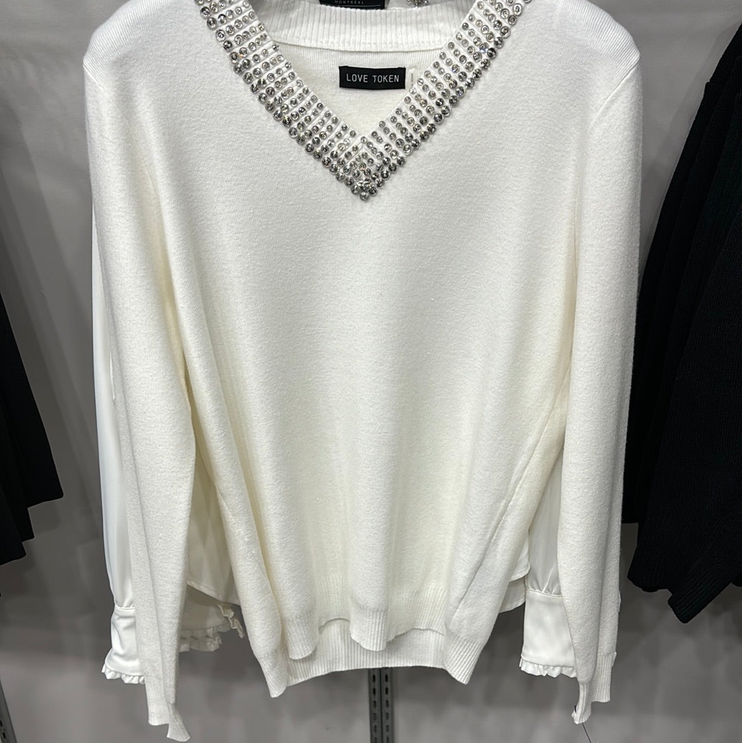 VNECK COTTON BEADED SWEATER