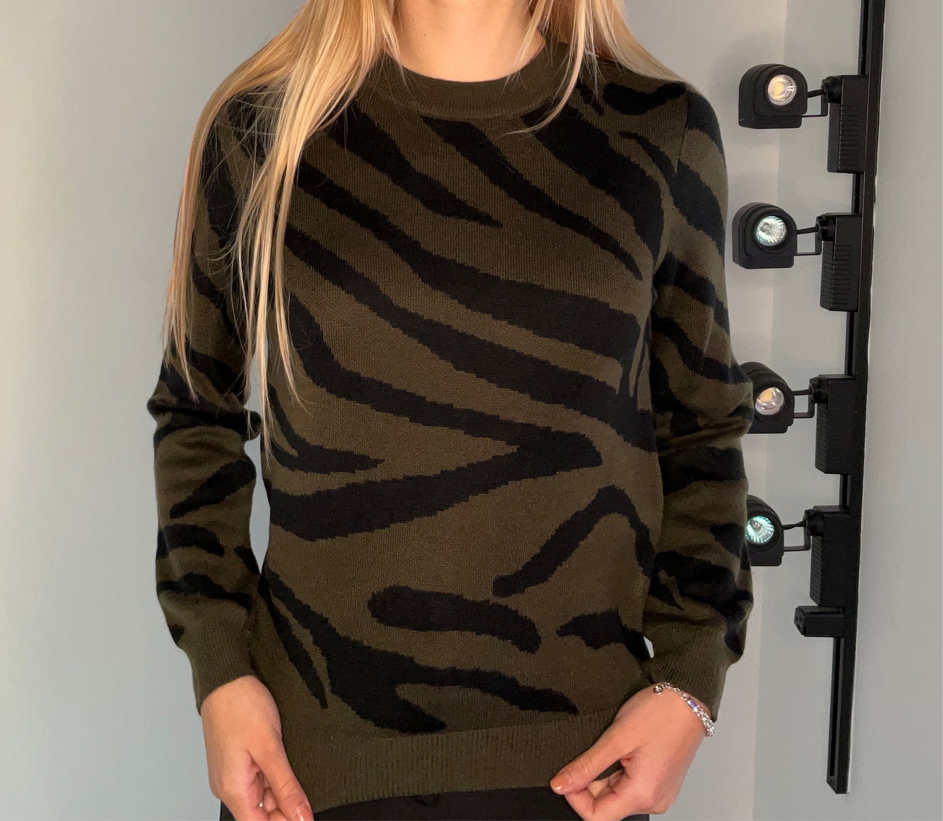 zebra stripped sweater. Model is wearing a size S. 100% acrylic.